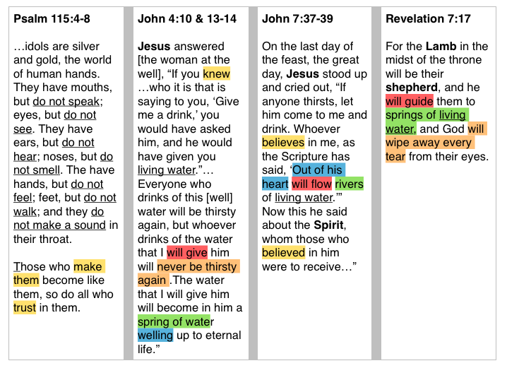 Below is a picture of Psalm 115 side-by-side with three passages about living water. I love studying scriptures parallel to each other. It’s not the only way to study and read the Bible, but I find it to be a helpful, pointed way to hone in on a truth, promise, idea, etc…