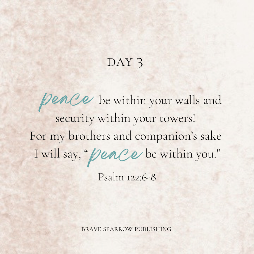 The word peace is used to describe the absence of war or hostility between people, friends, even nations. But more than that*, it speaks of wholeness and harmony. There is a difference between not fighting and being harmonious. David writes a prayer of true peace for Jerusalem. I like to pray this prayer too and also use it for my region.