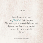 Peace I leave with you; my peace I give to you. Not as the world gives do I give to you. Let not your hearts be troubled, neither let them be afraid … I say these things to you, that in me you may have peace. In the world, you will have tribulation. But take heart; I have overcome the world. John 14:27 / John 16:33.
